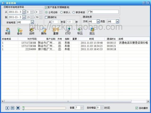 本系統(tǒng)支持多種錄音查詢方式:可根據(jù)通話時間、本地電話號碼、客戶的電話號碼、通話時長、打進/打出的通話類型來查詢,選中當(dāng)前錄音文件可直接播放該錄音。