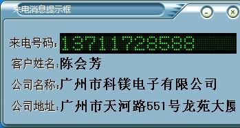 當(dāng)電話響起,COME-800來電顯示客戶管理系統(tǒng)會立即在電腦顯示屏上彈出來電人的姓名、單位、職務(wù)、經(jīng)營范圍、以往的交易記錄、業(yè)務(wù)關(guān)系等,來電者信息盡收眼底,一目了然,讓您在談話之前已心中有數(shù),不但能有效打破距離隔閡,而且有利于把握談話的主動權(quán),對客戶的問題、客戶關(guān)系處理能做到胸有成竹,最小化彈屏如下: