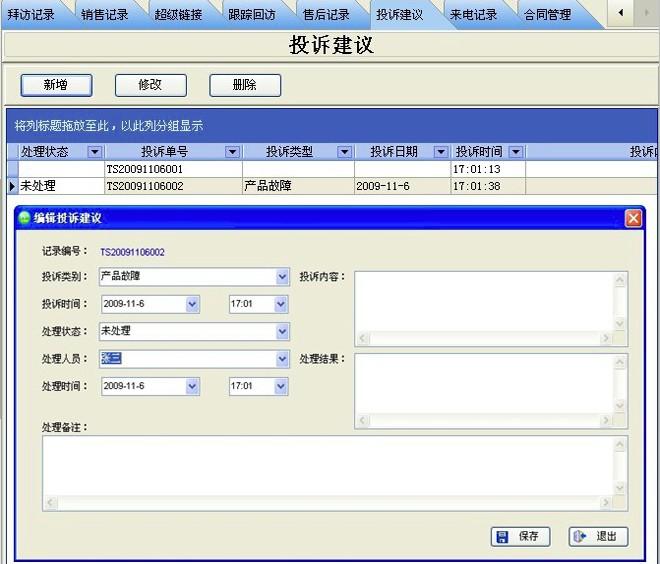 9、針對來電客戶立即顯示出跟蹤回訪/投訴建議/來電記錄/合同管理/超級鏈接;