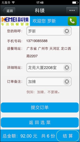 客戶注冊成功后,可以進(jìn)入會員中心,修改用戶的聯(lián)系方式,送餐地址等