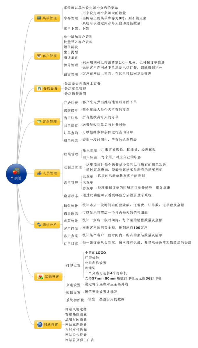 后臺管理功能比較多,為了更清晰地表達(dá),我們用一張思維導(dǎo)圖來展示,由于國內(nèi)快餐店的模式各有物色無法統(tǒng)一,根據(jù)客戶的實(shí)際情況靈活配置,這里僅以通用的模式來說明: