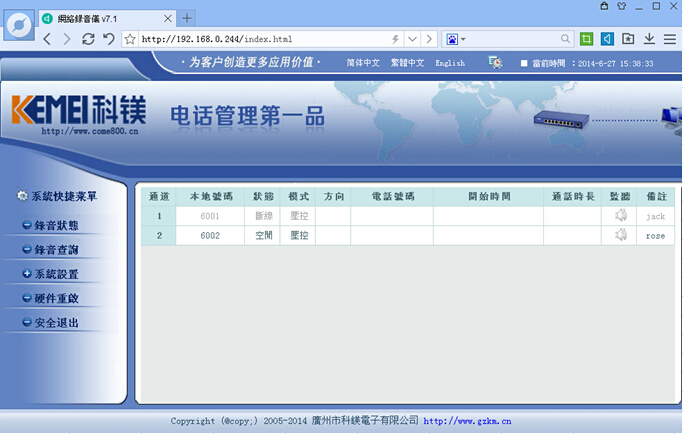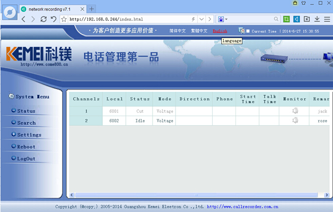 3.2、進(jìn)入系統(tǒng)后能看到每個(gè)通道的通話(huà)狀態(tài),(三種語(yǔ)言界面任意切換)