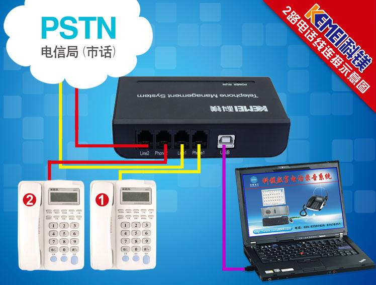 COME800-R02電話錄音系統(tǒng),硬件通過電腦的USB接口連接,將通話錄音和來電去電號碼保存在電腦的硬盤上,結(jié)合相應的軟件,實現(xiàn)各種錄音查詢功能,錄音盒與電腦的連接示意圖如下: